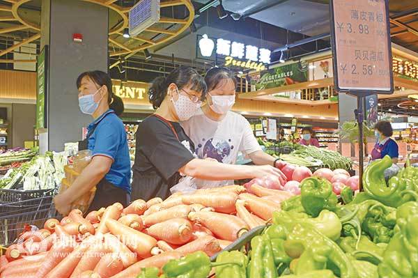 7月3日,市民在華夏超市選購商品。近期,宿城各大超市米面油、蔬菜、水果、肉類等生活必需品供應(yīng)充足、品種豐富、價格穩(wěn)定,可滿足市民日常需求。 記者 王明輝 攝