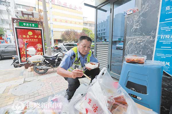 7月7日,在泗縣泗州大道執(zhí)勤崗?fù)づ裕h交警大隊城區(qū)中隊隊員正在用午餐。
