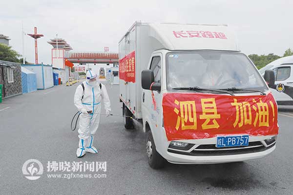 7月7日,在泗縣屏山高速出入口處,工作人員正在對過往車輛進行消殺。