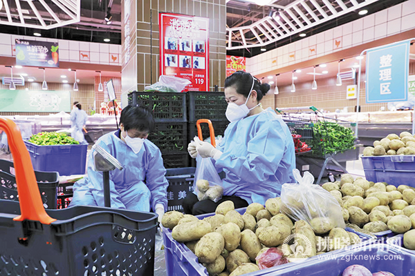 7月7日,泗縣佳美超市的工作人員根據(jù)線上訂單分揀商品。連日來,泗縣把保障群眾生產(chǎn)生活擺在突出位置,積極調(diào)配各類生活必需品,建立物資保障配送體系,實(shí)行貨源日報監(jiān)測機(jī)制,組織協(xié)調(diào)保供企業(yè)、社區(qū)服務(wù)等各個環(huán)節(jié)。目前,8家大型商超和15家較大商超全部開啟保供模式,小型生鮮商超已啟用60個,基本形成覆蓋城鄉(xiāng)的保供網(wǎng)絡(luò),切實(shí)保障百姓生活秩序平穩(wěn)有序。 記者 蘇洋 攝