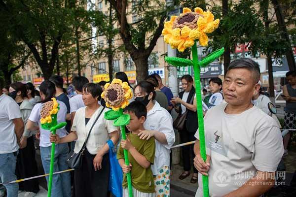 宿州二中考點外,家長手舉“向日葵”靜靜等候,祝愿孩子“一舉奪魁”。