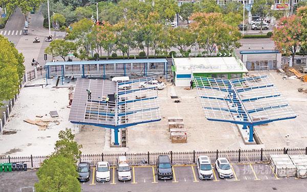 10月19日,航拍正在施工中的宿城迎賓大道和淮海路交叉口東北角新能源汽車充電停車場。今年以來,我市通過盤活城區邊角地塊新建停車場、增加新能源停車泊位等舉措擴容增量,有效緩解市民“停車難,充電煩”的困擾。目前,全市新增公共停車泊位近2800個,城市停車泊位達3.1萬余個。