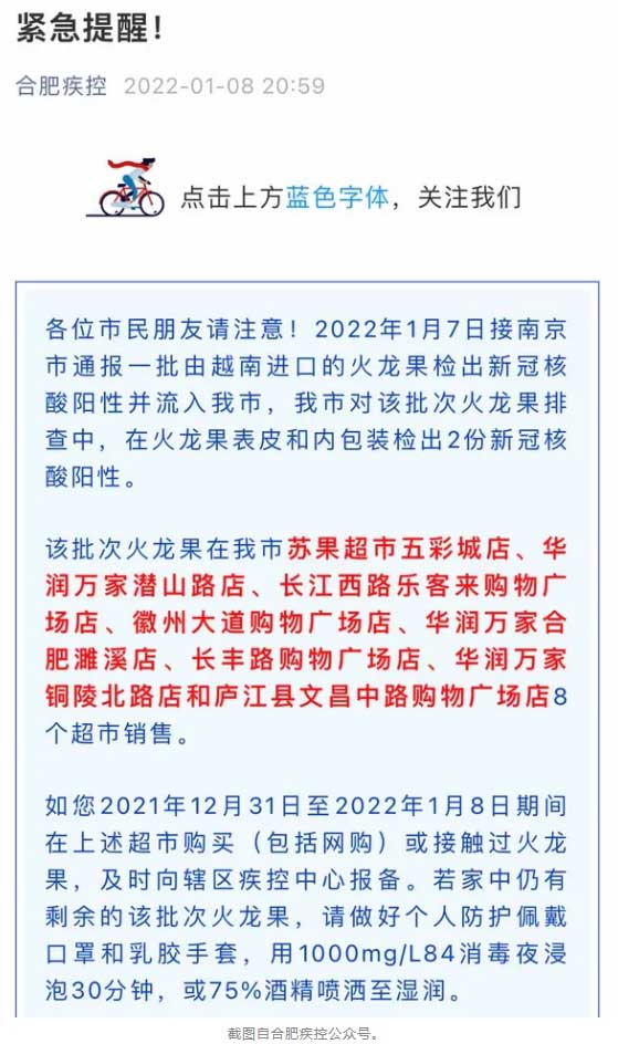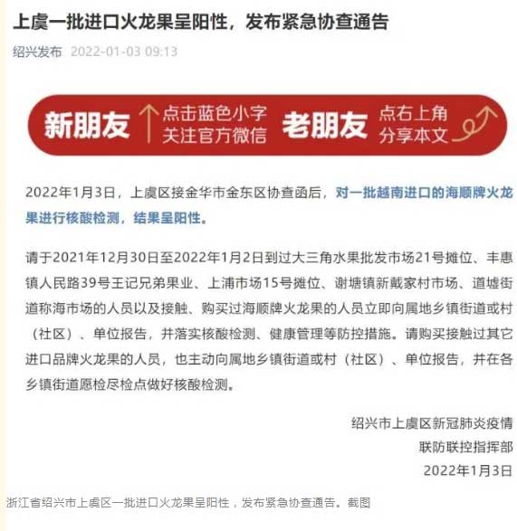 2022年元旦當天,浙江金華永康市新型冠狀病毒肺炎疫情防控指揮部就發布通告稱,永康市疾控中心接上級通知,對一批越南進口的火龍果進行核酸檢測,結果呈弱陽性。