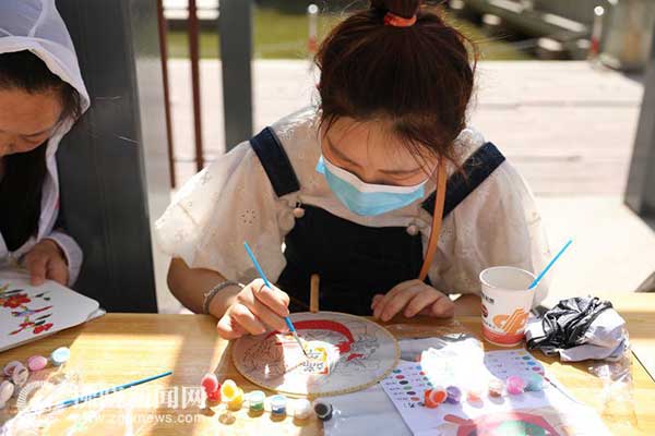 6月2日,在埇橋區(qū)三八街道金園社區(qū)小廣場(chǎng),市民正認(rèn)真畫(huà)團(tuán)扇。 劉寧剛 攝