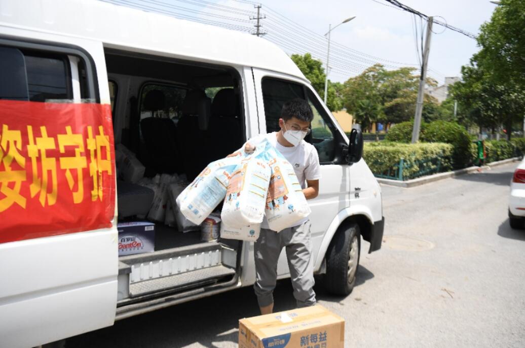 7月3日,在泗縣桃李文苑小區(qū),一母嬰用品店的工作人員在為小區(qū)居民配送母嬰用品。新華社記者黃博涵 攝