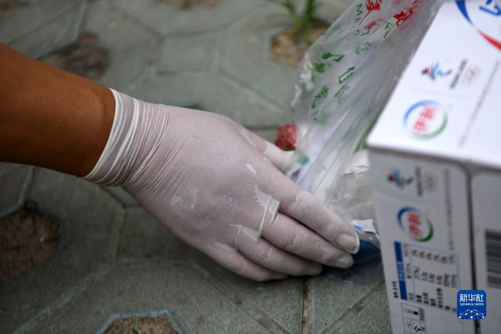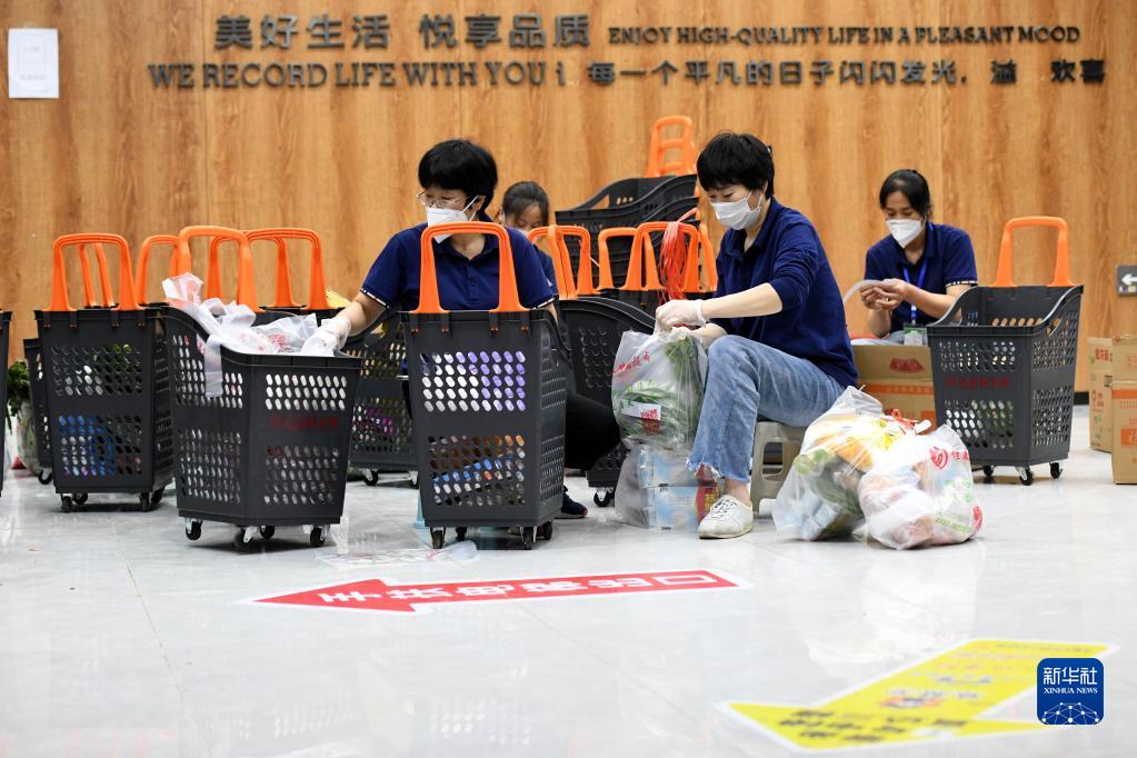 7月4日,泗縣玉蘭小區志愿者整理小區居民購買的商品。