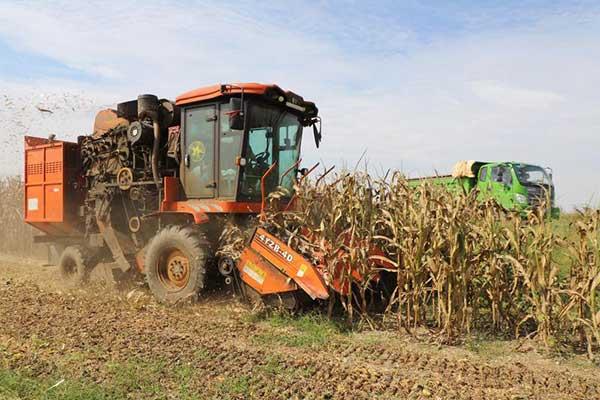 資料圖片:大型機(jī)械正在埇橋區(qū)西二鋪鎮(zhèn)收獲玉米。特約攝影 張成伍