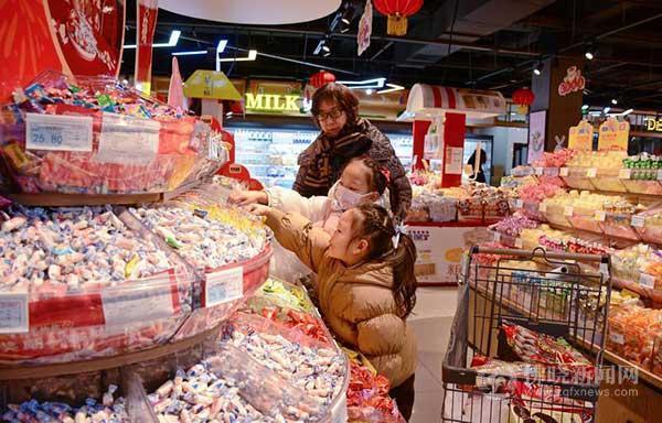 1月23日,小朋友跟隨家人在宿城華夏超市選購零食。