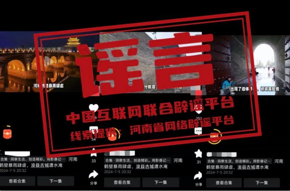 真相:近日,有網民在網絡平臺發(fā)布內容為“河南鶴壁暴雨肆虐,浚縣古城遭水淹”的視頻信息,引發(fā)社會關注。經核實,7月5日浚縣出現暴雨天氣,強降雨期間浚縣古城北大街、東城門廣場等處出現積水情況,經過積極排澇,雨停后路面積水很快被排空,恢復正常通行,不存在視頻中所說的“古城風貌受損嚴重”“古城內的部分城墻、古街巷出現不同程度的損毀”“古城墻出現了墻體開裂、坍塌等險情”“古城內的博物館、紀念館等文化設施也遭受不同程度的損失”等現象。該視頻多為當地舊聞及外地視頻嫁接拼湊。目前,浚縣古城秩序正常。(來源:河南省網絡辟謠平臺、浚縣古城保護建設服務中心)