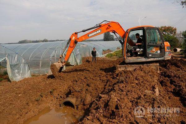 9月21日,在埇橋區順河鎮四里中村,村民用挖掘機清溝瀝水。近期埇橋區降雨量較大,該村農民展開清溝瀝水埋設涵管,保證“三秋”工作順利進行。特約攝影 祝家剛