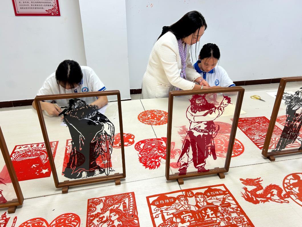 安徽靈璧縣高級職業(yè)技術(shù)學(xué)校學(xué)生在老師的指導(dǎo)下學(xué)習(xí)鐘馗剪紙