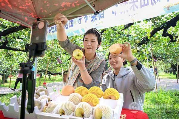 碭山采梨節活動上,梨農張雪芝(左)通過視頻直播的方式銷售酥梨。特約攝影 崔猛