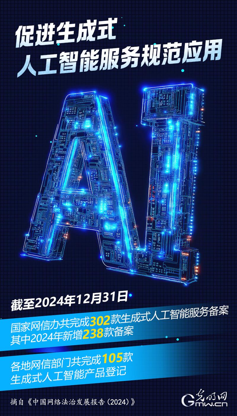 截至2024年12月31日,國家網信辦共完成302款生成式人工智能服務備案,其中2024年新增238款備案。各地網信部門共完成105款生成式人工智能產品登記。