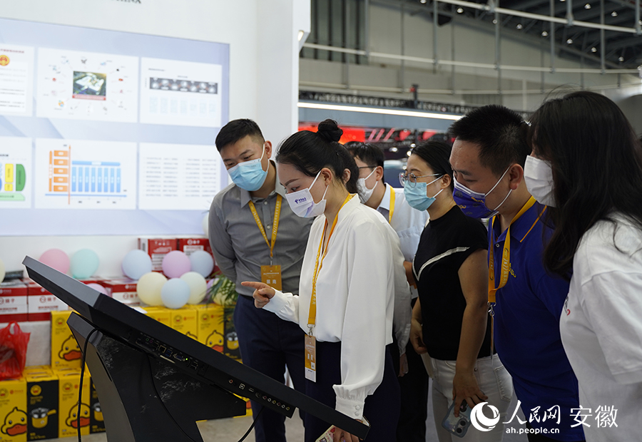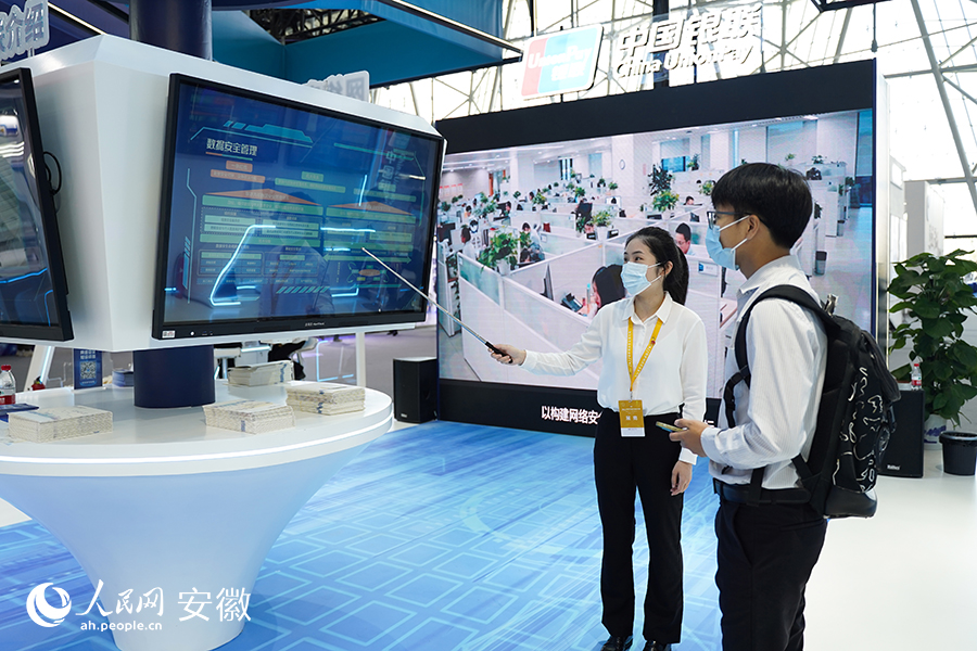 工作人員正在向參觀者介紹網(wǎng)絡(luò)安全產(chǎn)品。人民網(wǎng) 李希蒙攝