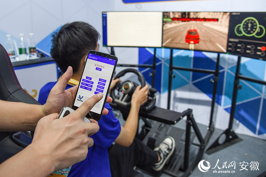 觀眾體驗(yàn)汽車仿真平臺(tái)網(wǎng)絡(luò)攻防演示。人民網(wǎng) 李希蒙攝