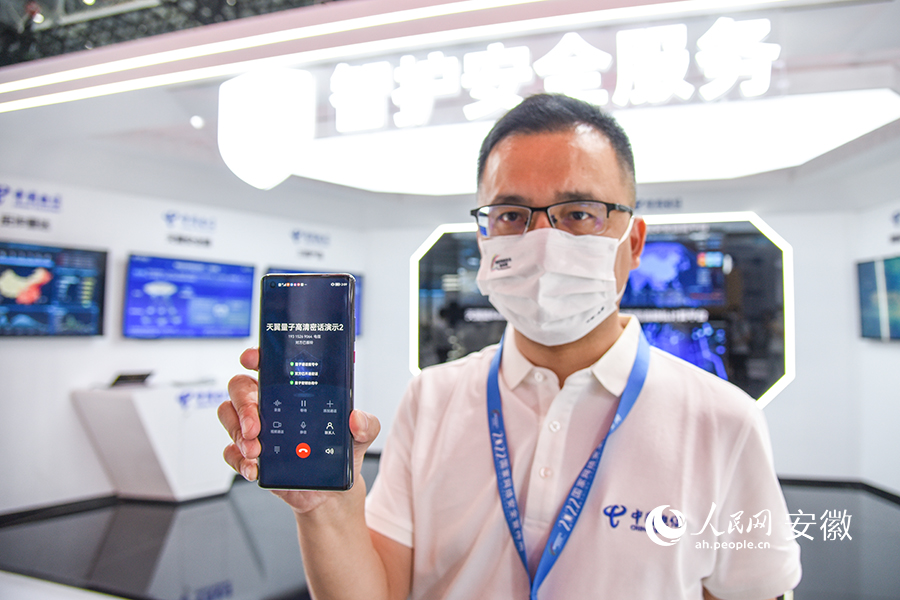 工作人員展示天翼量子高清密話。人民網(wǎng) 李希蒙攝
